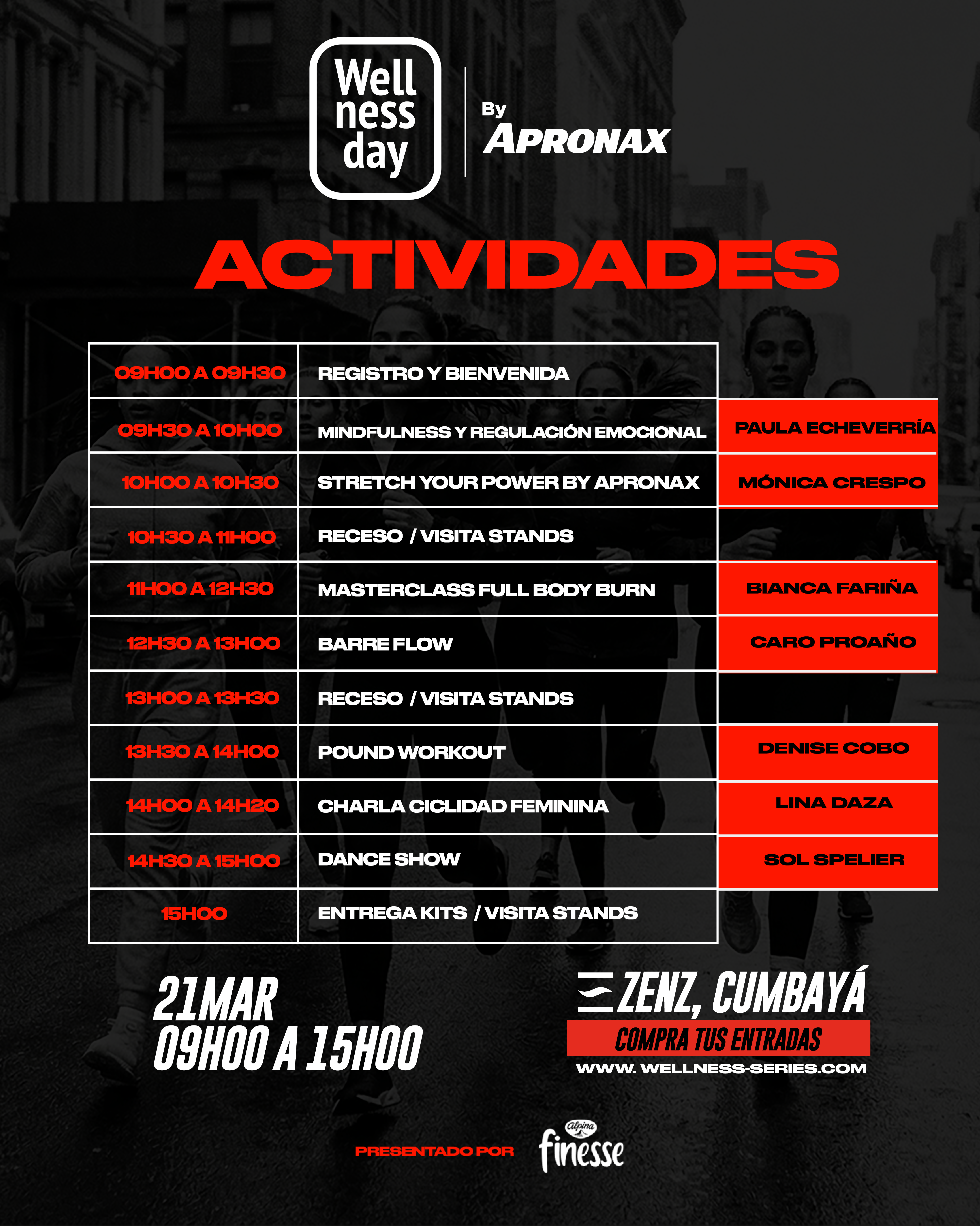 Wellness Series te invita a ser parte de WELLNESS DAY, una experiencia única diseñada para reconectar con tu cuerpo, tu mente y tu energía. Este 21 de marzo de 2026, prepárate para una jornada donde el movimiento, el autocuidado y la comunidad se encuentran en un solo lugar. PREVENTA $25 hasta el 20 de Febrero – Normal $30.